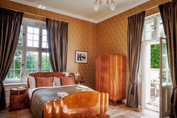 Dunkle Tapeten mit goldenenen Aufdrucken schaffen eine elegante und gleichzeitig gemütliche Atmosphäre. „Sie werden in der Fabrik Bradbury & Bradbury in Francisco handgefertigt, in den gleichen Farben und Mustern wie vor hundert Jahren“, erklärt Hoteldirektorin Zuzanna Busłowska. Dass er ausgerechnet die Epochen des Jugendstils, der Sezession und des Biedermeier für die Einrichtung gewählt hat, lässt mich vermuten, dass Besitzer Tomasz Bałuk ein Mensch ist, der gern nach den Sternen greift. Ein sensibler, aber ambitionierter Geist, der so lange sucht, bis er genau das gefunden hat, was ihm vorschwebt – sich dabei gern im Hintergrund hält und lieber sein Haus für sich sprechen lässt.
